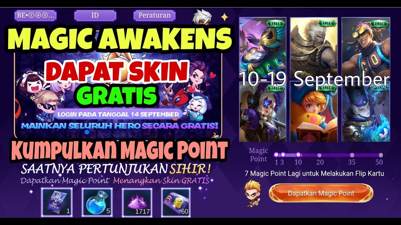 Untuk skin elite gratis dan bisa memainkan semua hero secara gratis ini berlangsung dari tanggal 14 20 september 2019.